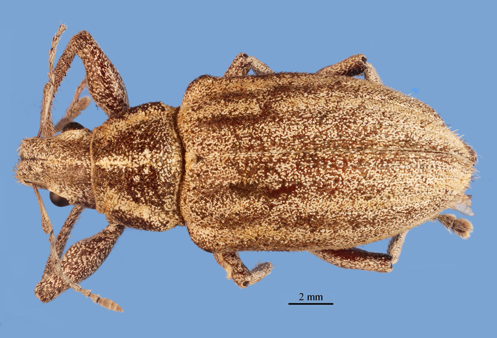 Naupactus argentinensis is a large species, densely covered with small ash-grey scales and short recumbent setae. Antennae are broad, pronotum is truncate-conical, with strongly curved flanks, convex disc, deep midline sulcus, and bisinuate beveled base; elytra have strongly bisinuate base, broad humeri, uneven intervals 3°, 5° and 7° more convex the even intervals; front tibiae bear large denticles on inner margin and corbels of hind tibiae are broad, squamose. Males are unknown.